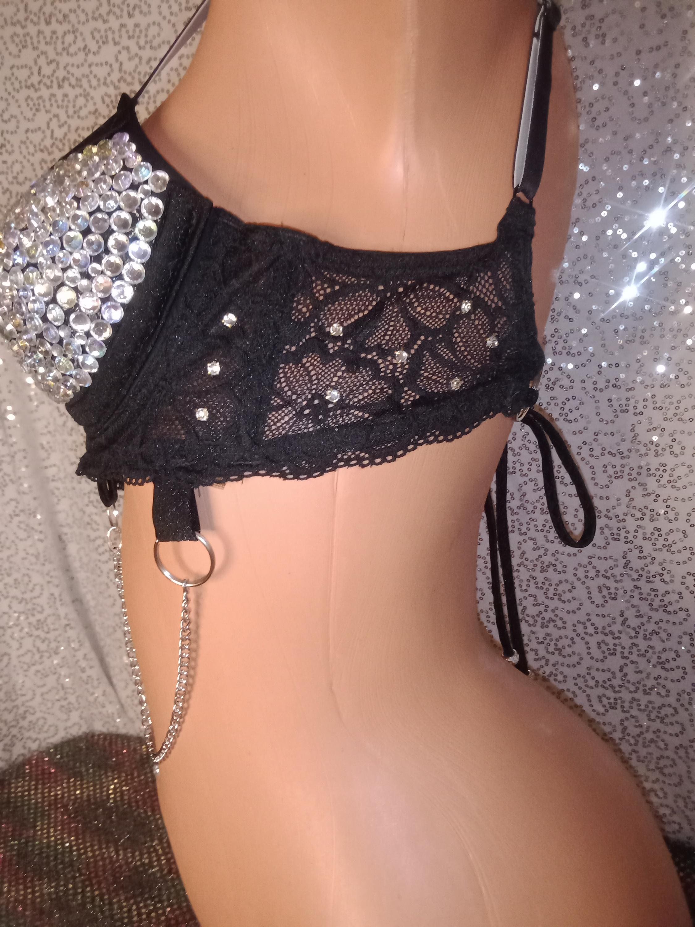 SOLD SEPARATELY IN DROP DOWN MENU. Order bra or waist chain, thong 1 or all 3. Bra is made by production partner, stones are acrylic sewn not glued. The rest of the outfit is hand made. Thong and waist chain are hand made by Laura Edgar (me).