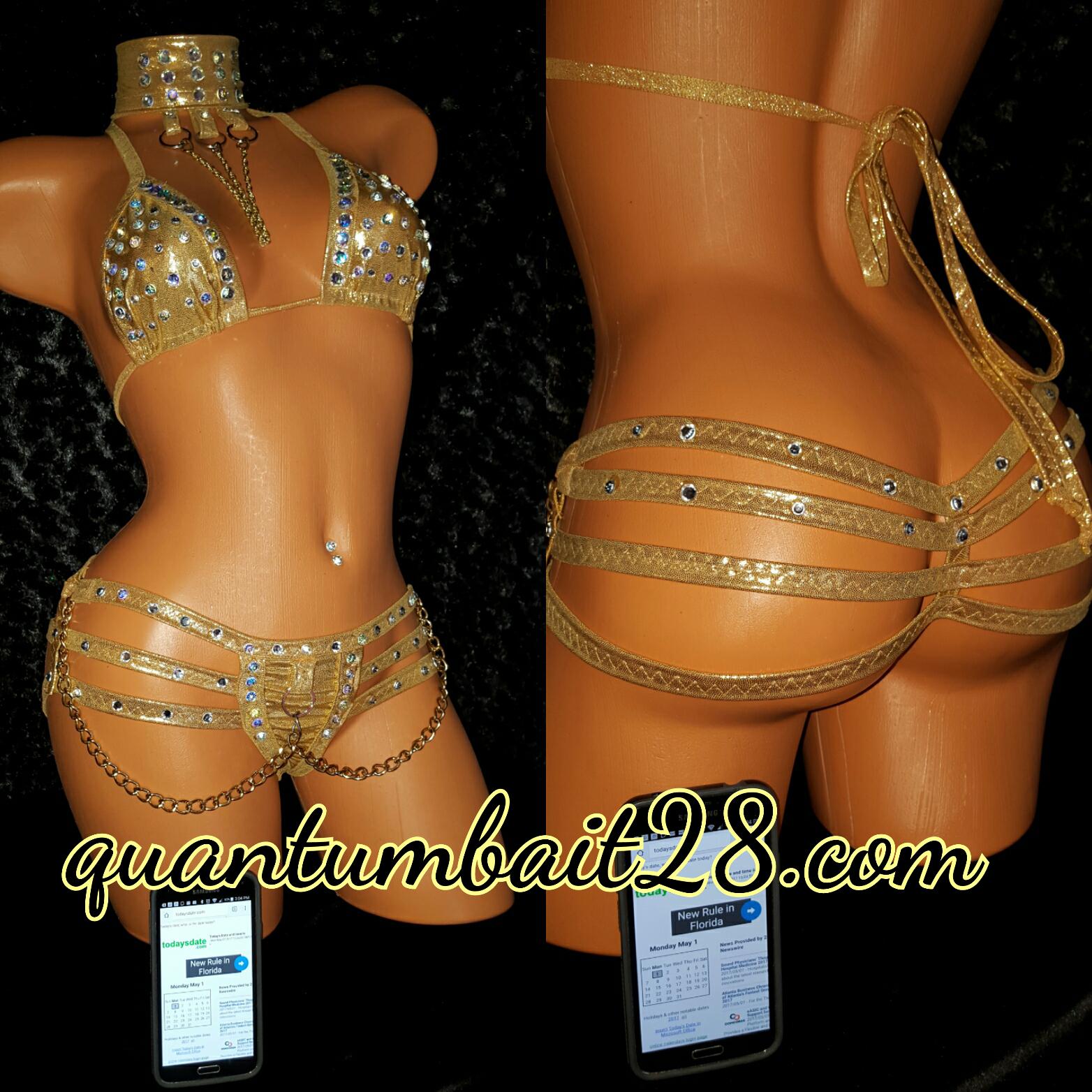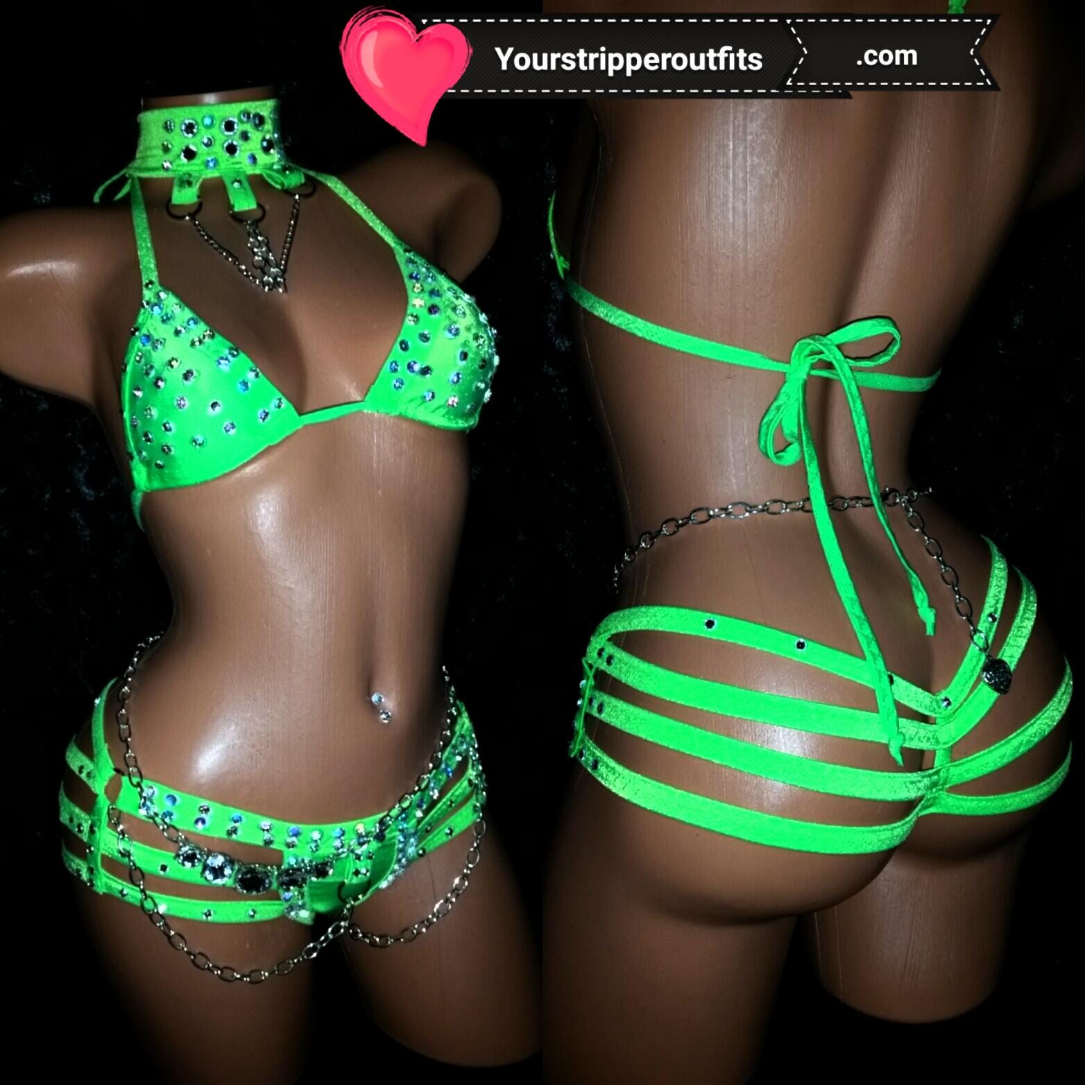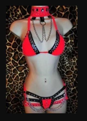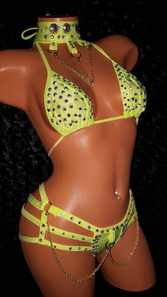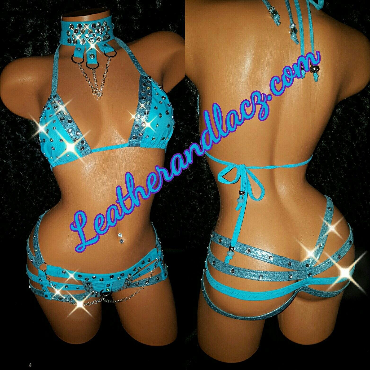 Choker, Triangle Top and Quad Thong. The outfit has chain and rhinestones, . Materials are acrylic crystals, high quality Spandex 6oz per square yard, 4-way stretch. Please allow 3 days handling time for creating. Covered in stones. Hand wash cold water hang dry. Custom made by Laura Edgar The Costume Lady 30 years sewing experience specializing in exotic dancewear.